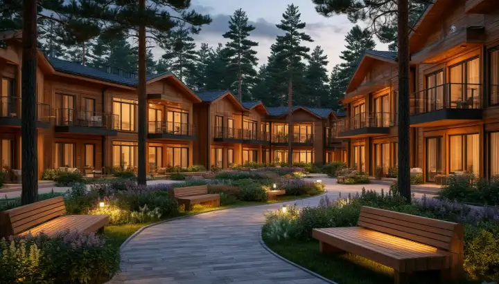 Концепция «Эхо леса» основана на идее органичного сочетания архитектуры и пейзажного окружения. Переменная этажность пяти секций помогает сохранить панорамные виды и не затенять прилегающую территорию. Натуральные оттенки фасадов — от глубокого коричневого до спокойного бежевого — гармонируют с цветовой гаммой лесного массива.